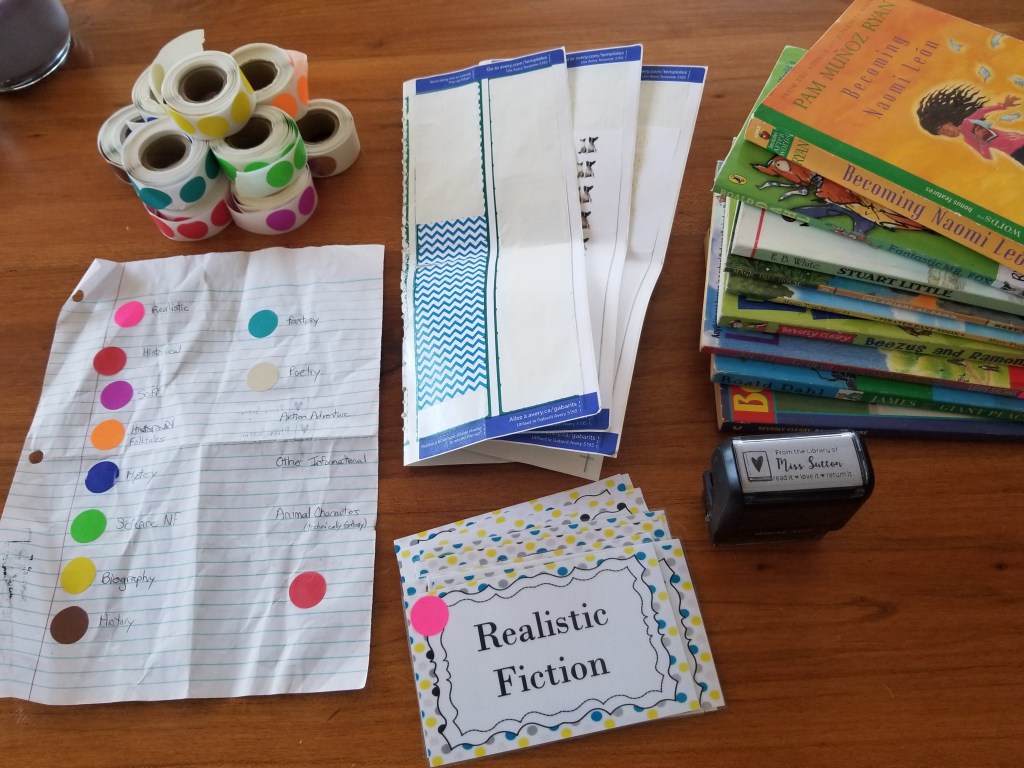 I started by sorting the books into genres and choosing a sticker color for each one. You can tell by the picture right beneath “Supplies” (scroll down) that I used a super high-tech way to create a key for the colors and genres: a piece of notebook paper. Here are the genres I used:
