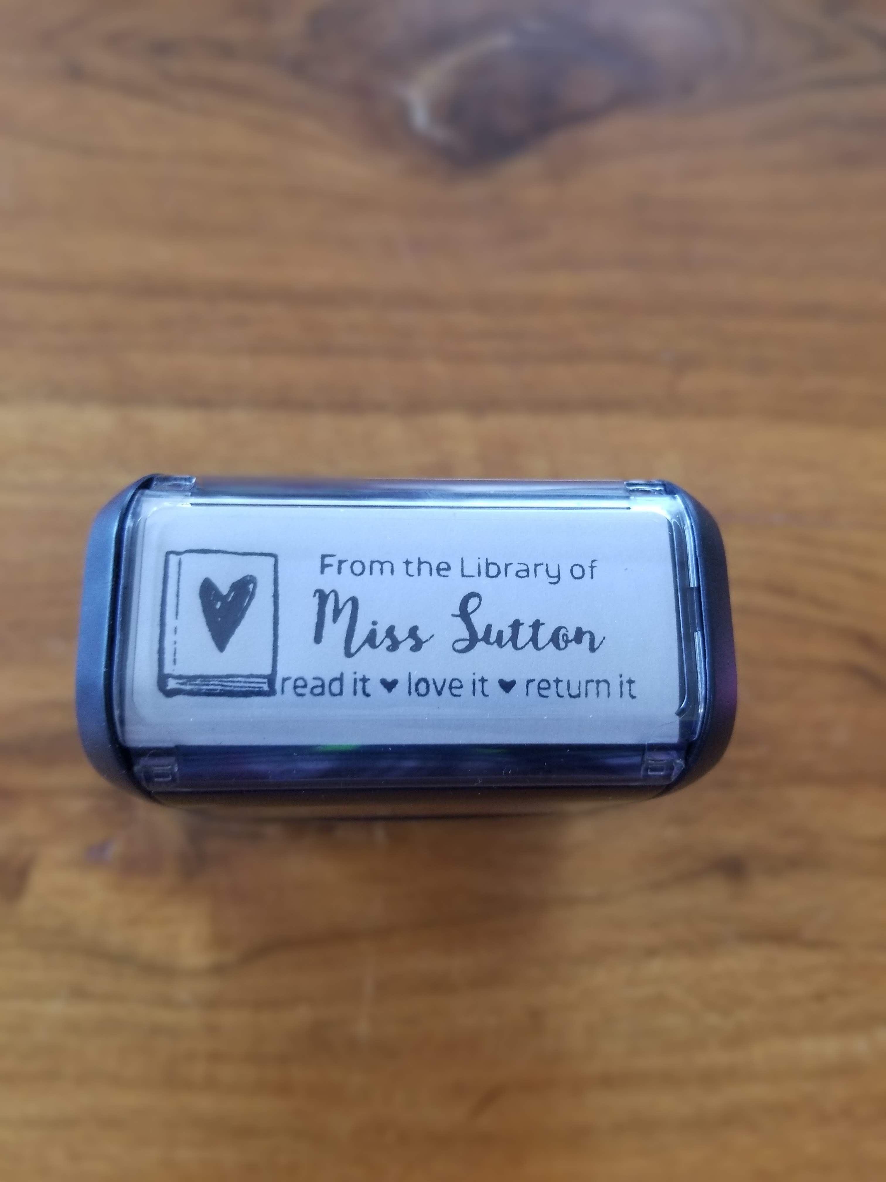 This was a suggestion from The Book Whisperer that I’m glad I followed. I bought this adorable customized stamp from 904Custom.com. It cost $17.95 at full price at the time I purchased it, but at they often have back-to-school sales for teachers. Between that and the book labels, it helps everyone – including the school librarian – to recognize where your books belong. Plus, how fun is this stamp??