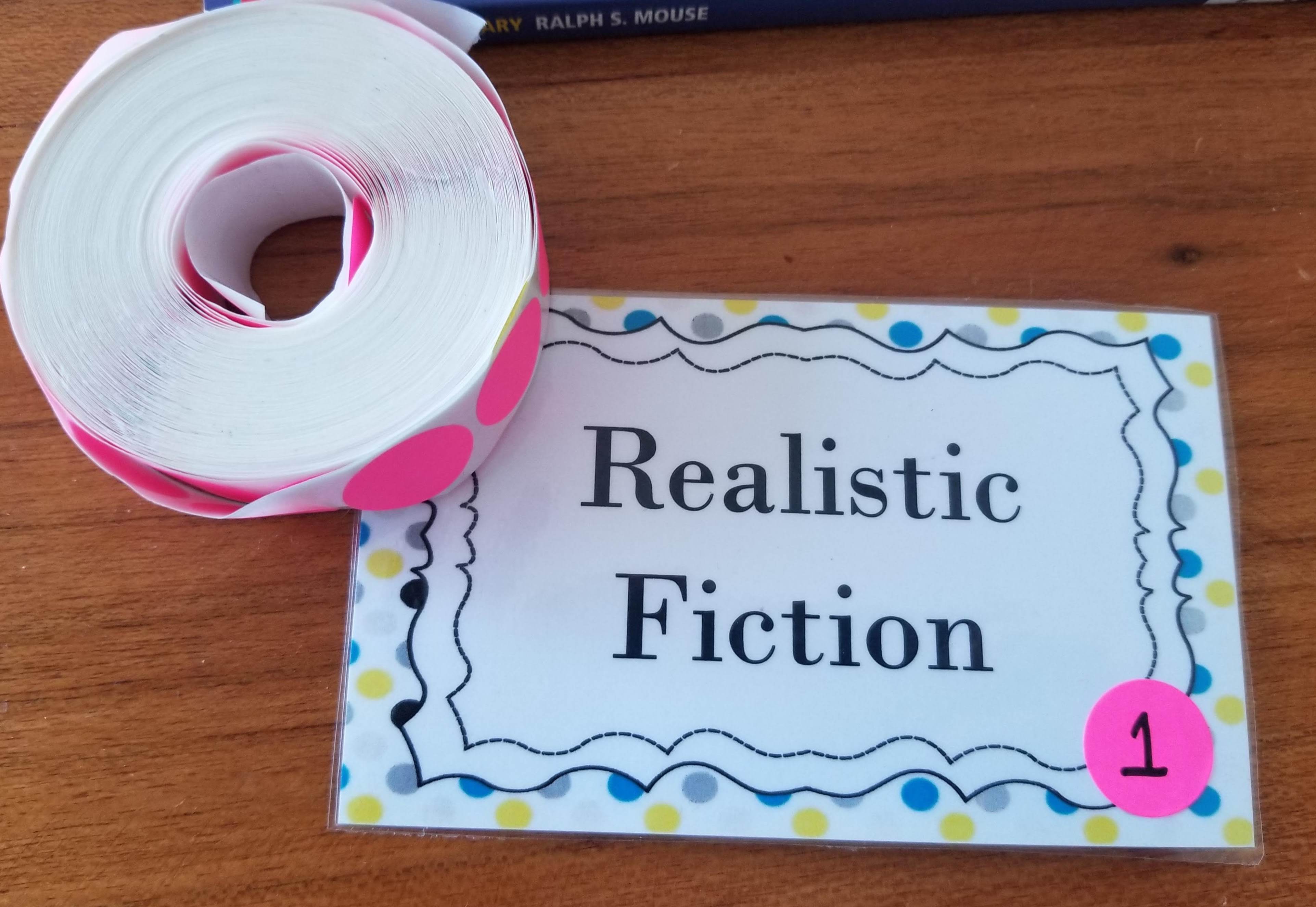 I used 3/4″ round labels for most of the books – like the kind you’d use on items at a garage sale. I used these mainly because they were a hand-me-down from another teacher-friend. I haven’t been able to find a place that sells this many different colors in rolls online, though I have found some that sells them in sheets. If you know of a place, please comment below! You could also choose to use a different kind of sticker label. For instance, I also printed some Avery 5195 labels for the animal, action/adventure, and “other informational” genres.