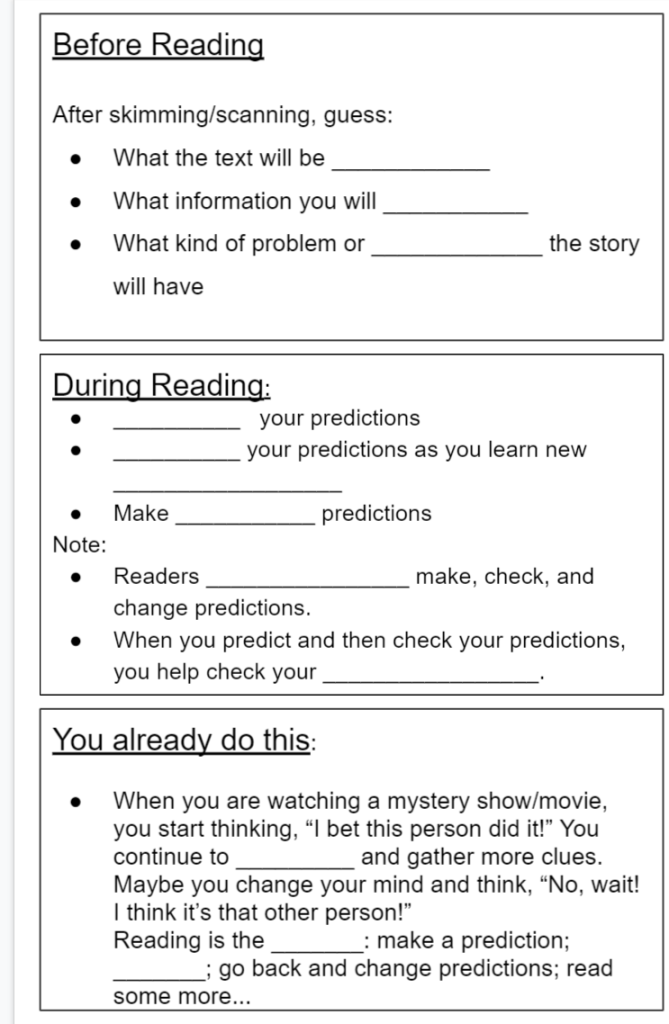 Forcing students to capture their thoughts on paper helps them become aware of the thoughts they’re actually having when they read. This, in turn, helps them predict and question more often, which is the goal.