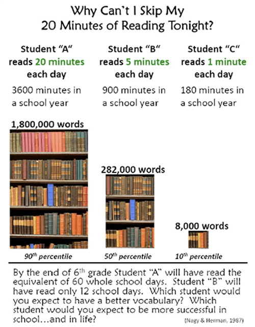 The difference between a kid who reads 20 minutes per day versus fewer minutes per day is vast. Daily reading for kids has many academic benefits, but it has even more benefits for…well, life.